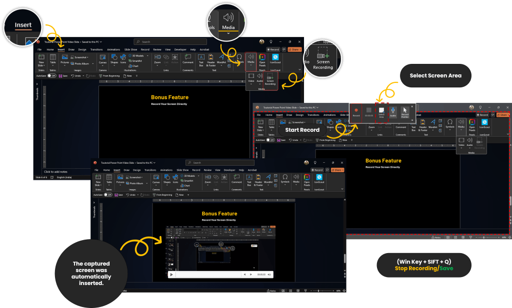 Record Your Screen Directly: Need to demo software or walk through website navigation? Use Insert > Screen Recording to capture the action right onto a slide – incredibly useful for tutorials!