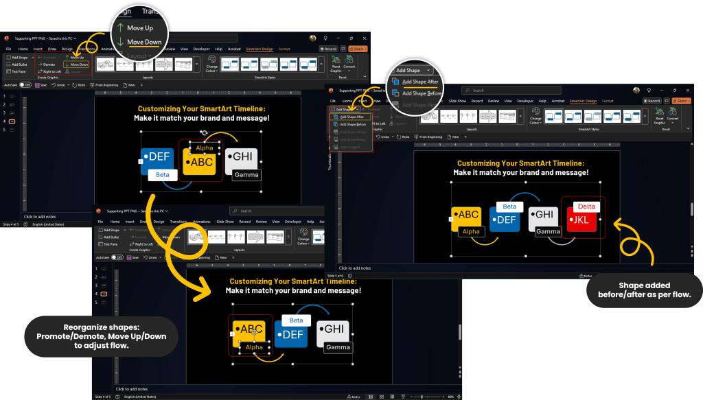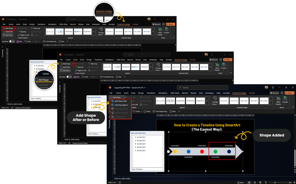 5. Need to add more events? Select the timeline graphic, go to the SmartArt Design tab, and click Add Shape (choose ‘Before’ or ‘After’ as needed).