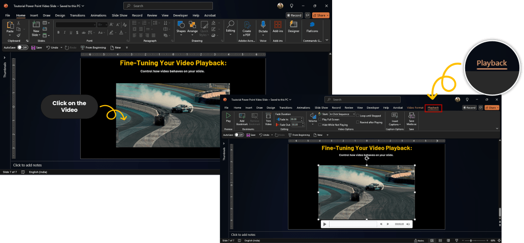 - Select the inserted video. A Playback tab will appear on the ribbon.