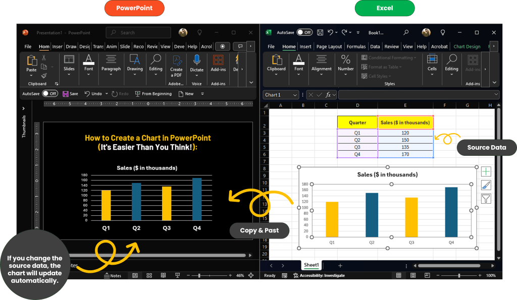 5. Expert Tip: Working with frequently updated Excel data? Create the chart in Excel first. Then, copy and paste it into PowerPoint, selecting the option to keep it linked to the source file. This ensures your chart always reflects the latest numbers automatically!