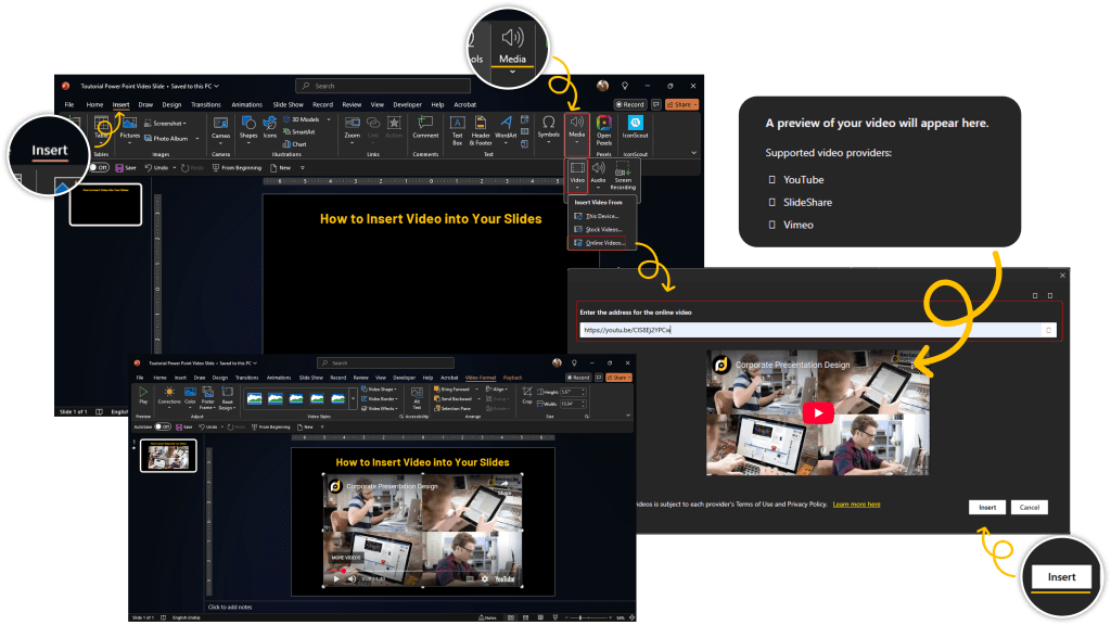 - Online Video (e.g., YouTube): Go to Insert > Video > Online Videos. Paste the URL of the video, and PowerPoint will embed it. (Ensure you have the right permissions to use online content).