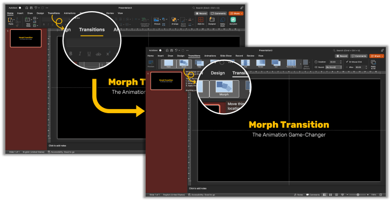 Where to find it: Transitions tab → Morph (in the Transition to This Slide group)