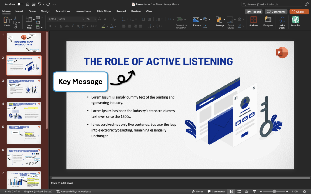 For example, dedicate a slide to “The Role of Active Listening” with an insight and example.