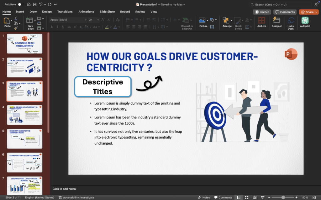 - Make slide titles the main message. For instance, instead of “Company Goals,” try “How Our Goals Drive Customer-Centricity.” See the difference? The moment you change the line, the impression of slides multiple