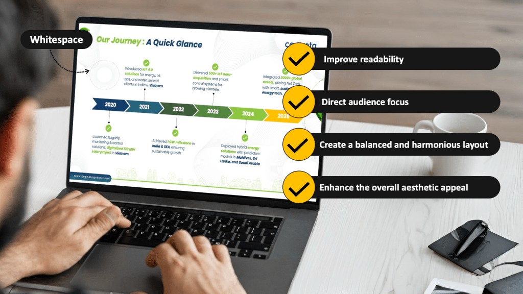 - Establishes Visual Hierarchy: Whitespace helps in organizing content, indicating which elements are related and guiding the viewer’s eye through the slide.